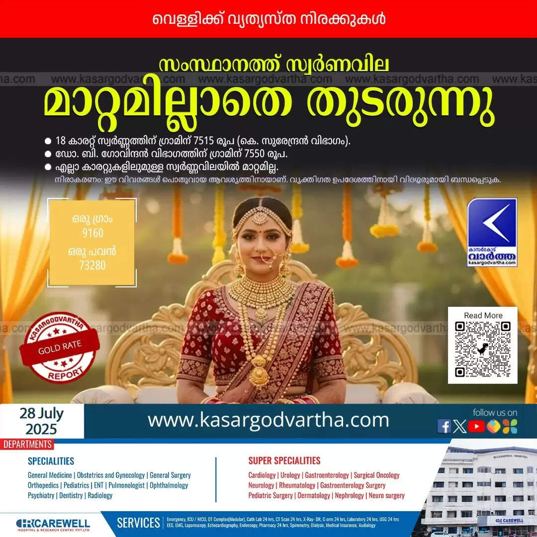 Article Summary: Gold price remains unchanged in Kerala today, July 28; sovereign at ₹73,280.