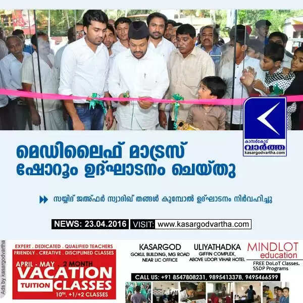 കാസര്കോട്: (www.kasargodvartha.com 23/04/2016) മിഡില് ഈസ്റ്റ് യൂറോപ്യന് രാജ്യങ്ങളില് പ്രശസ്തമായ മെഡിലൈഫ് മാട്രസിന്റെ ഷോറൂം എരിയാലില് പ്രവര്ത്തനമാരംഭിച്ചു. സയ്യിദ് ജഅ്ഫര് സ്വാദിഖ് തങ്ങള് കുമ്പോല് ഉദ്ഘാടനം നിര്വഹിച്ചു.