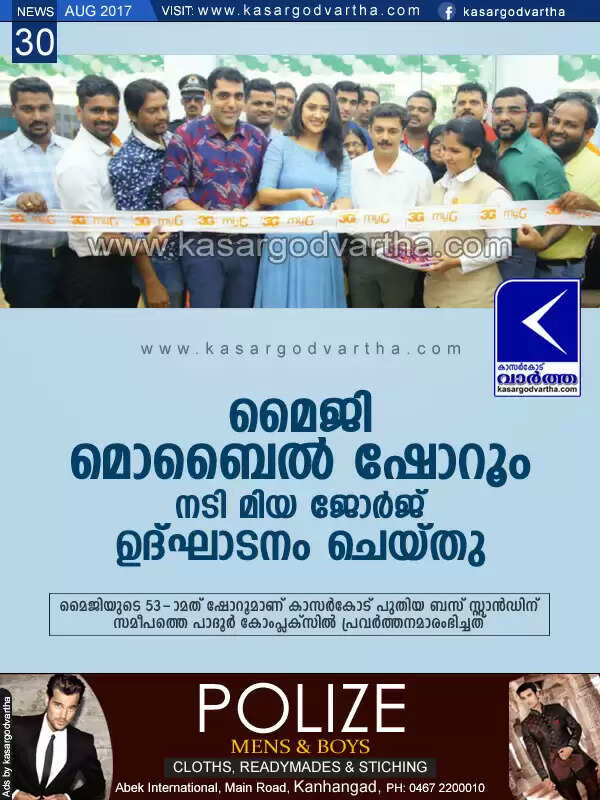 കാസര്കോട്: (www.kasargodvartha.com 30.08.2017) കേരളത്തിലെ ഏറ്റവും വലിയ മൊബൈല് വിതരണക്കാരായ മൈജി മൊബൈലിന്റെ ഷോറൂം കാസര്കോട് പുതിയ ബസ് സ്റ്റാന്ഡിന് സമീപത്തെ പാദൂര് കോംപ്ലക്സില് തെന്നിന്ത്യന് നടി മിയ ജോര്ജ് ഉദ്ഘാടനം ചെയ്തു.