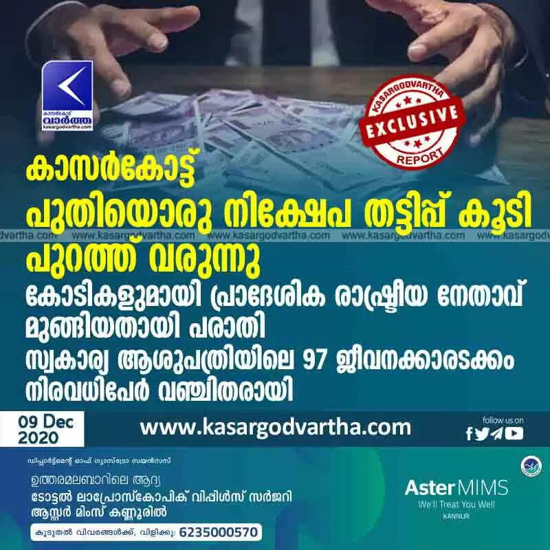 കാസര്‍കോട്ട് പുതിയൊരു നിക്ഷേപ തട്ടിപ്പ് കൂടി പുറത്ത് വരുന്നു; കോടികളുമായി പ്രാദേശിക രാഷ്ട്രീയ നേതാവ് മുങ്ങിയതായി പരാതി; സ്വകാര്യ ആശുപത്രിയിലെ 97 ജീവനക്കാരടക്കം നിരവധിപേര്‍ വഞ്ചിതരായി
