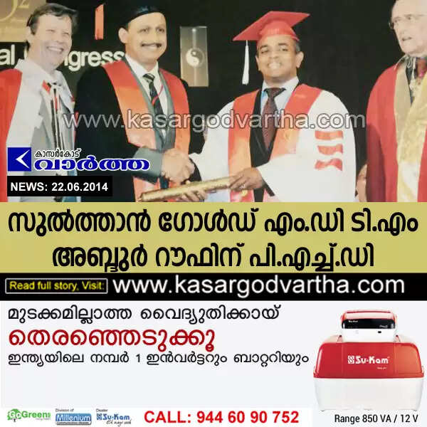 22 വര്ഷമായി ഡയമണ്ട്, ഗോള്ഡ് വ്യാപാര രംഗത്ത് വ്യക്തിമുദ്ര പതിപ്പിച്ച വ്യക്തിത്വമാണ് കുമ്പള സ്വദേശിയായ അബ്ദുര് റൗഫ്. മലേഷ്യയിലെ കോലാലംപൂരില് നടന്ന ചടങ്ങില് അദ്ദേഹം ബിരുദം ഏറ്റു വാങ്ങി. തന്റെ ഈ നേട്ടം വ്യാപാര രംഗത്ത് കൂടുതല് ശോഭിക്കാന് പ്രചോദനമാകുമെന്ന് അദ്ദേഹം പറഞ്ഞു.