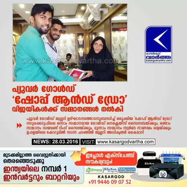 ഒന്നാം സമ്മാനമായ ഗോള്ഡ് നെക്ലെയ്സ് സൈനബയ്ക്കും, രണ്ടാം സമ്മാനം ഡയമണ്ട് റിംഗ് സൈദയ്ക്കും, മൂന്നാം സമ്മാനം സ്വര്ണ നാണയം രമ്യയ്ക്കും ഉപ്പളയിലെ ഷോറൂമില് നടന്ന ചടങ്ങില് ജ്വല്ലറി അധികൃതര് കൈമാറി.