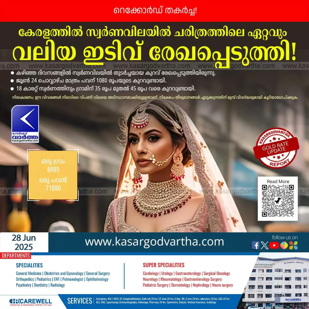 ● ബുധനാഴ്ച (ജൂൺ 25): 22 കാരറ്റ് സ്വർണത്തിന് ഗ്രാമിന് 25 രൂപ കുറഞ്ഞ് 9070 രൂപയും പവന് 200 രൂപ കുറഞ്ഞ് 72,560 രൂപയുമെത്തി.