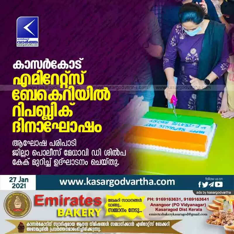 കാസർകോട്: (www.kasargodvartha.com 27.01.2021) രാജ്യം പരമാധികാരമായ റിപബ്ലിക് ദിനം ആഘോഷമാക്കി കാസർകോട് എമിറേറ്റ്സ് ബേകെറി. ആഘോഷ പരിപാടി ജില്ലാ പൊലീസ് മേധാവി ഡി ശില്‍പ കേക് മുറിച്ച് ഉദ്ഘാടനം ചെയ്തു.