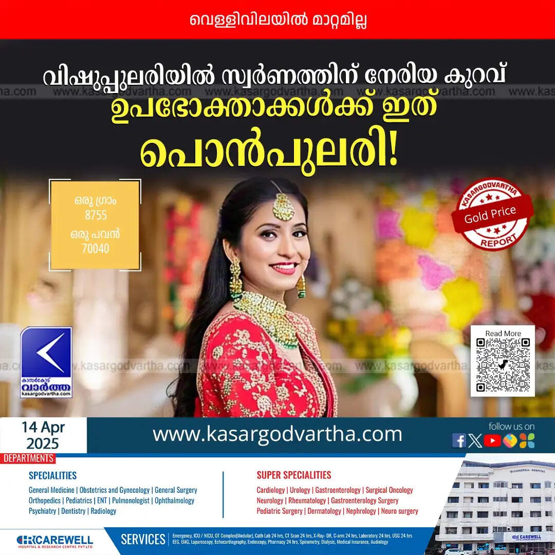 ഏപ്രിൽ 14-ന് 22 കാരറ്റ് സ്വർണത്തിൻ്റെ വില ഗ്രാമിന് 15 രൂപയും പവന് 120 രൂപയുമാണ് കുറഞ്ഞത്. ഇതോടെ 22 കാരറ്റ് സ്വർണത്തിൻ്റെ ഒരു ഗ്രാം വില 8755 രൂപയും ഒരു പവൻ സ്വർണത്തിന്റെ വില 70040 രൂപയുമായി കുറഞ്ഞു.