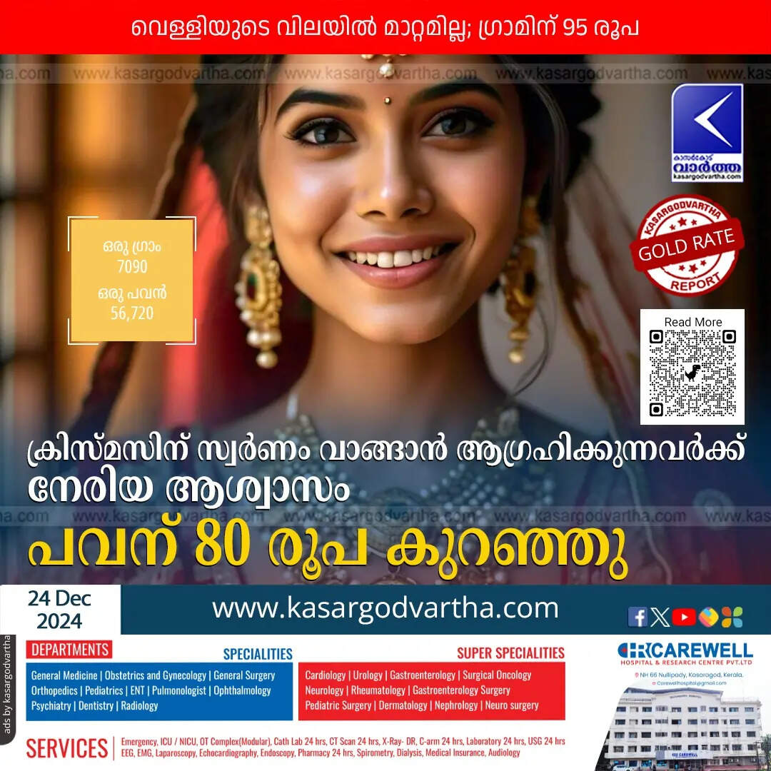 ● വെള്ളിയുടെ വിലയിൽ മാറ്റമില്ല; ഒരു ഗ്രാം വെള്ളിക്ക് 95 രൂപയാണ് വില.