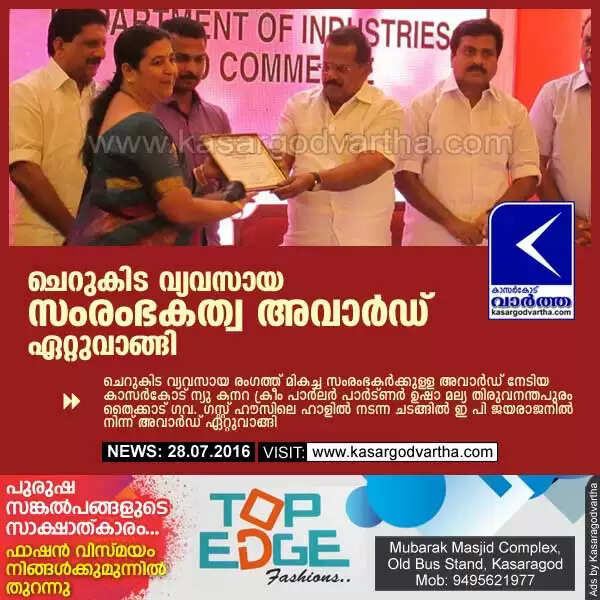 (www.kasargodvartha.com 28.07.2016) ചെറുകിട വ്യവസായ രംഗത്ത് മികച്ച സംരംഭകര്ക്കുള്ള അവാര്ഡ് നേടിയ കാസര്കോട് ന്യു കനറ ക്രീം പാര്ലര് പാര്ട്ണര് ഉഷാ മല്യ തിരുവനന്തപുരം തൈക്കാട് ഗവ. ഗസ്റ്റ ഹൗസിലെ ഹാളില് നടന്ന ചടങ്ങില് വ്യവസായ - സ്പോര്ട്സ് മന്ത്രി ഇ പി ജയരാജനില് നിന്ന് അവാര്ഡ് ഏറ്റുവാങ്ങുന്നു