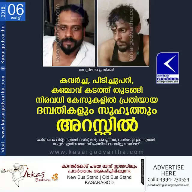 കുമ്പള: (www.kasargodvartha.com 06.03.2018) കവര്ച്ച, പിടിച്ചുപറി, കഞ്ചാവ് കടത്ത് തുടങ്ങി നിരവധി കേസുകളില് പ്രതിയായ ദമ്പതികളെയും സുഹൃത്തിനെയും പോലീസ് അറസ്റ്റു ചെയ്തു. കര്ണാടക വിട്ള സ്വദേശി റഷീദ് (33), ഭാര്യ ഖമറുന്നിസ (26), പെരിയാട്ടടുക്ക സ്വദേശി ഗഫൂര് (38) എന്നിവരെയാണ് കുമ്പള പോലീസ് അറസ്റ്റു ചെയ്തത്. കര്ണാടകയില് 17 കവര്ച്ച, പിടിച്ചുപറി കേസുകളില് പ്രതിയാണ് റഷീദെന്നും കഞ്ചാവ് കടത്തടക്കം നിരവധി കേസുകളില് പ്രതിയാണ് ഗഫൂറെന്നും പോലീസ് പറഞ്ഞു.