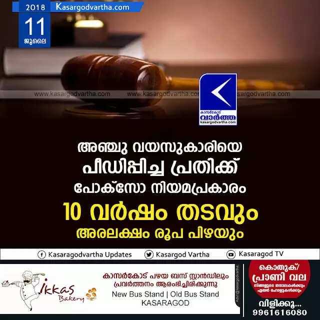 അഞ്ചു വയസുകാരിയെ പീഡിപ്പിച്ച പ്രതിക്ക് പോക്‌സോ നിയമപ്രകാരം 10 വര്‍ഷം തടവും അരലക്ഷം രൂപ പിഴയും