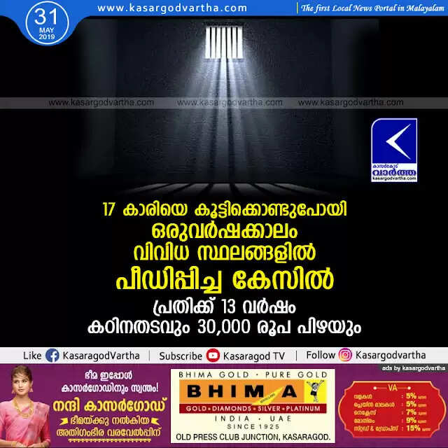 17 കാരിയെ കൂട്ടിക്കൊണ്ടുപോയി ഒരുവര്ഷക്കാലം വിവിധ സ്ഥലങ്ങളില് പീഡിപ്പിച്ച കേസില് പ്രതിക്ക് 13 വര്ഷം കഠിനതടവും 30,000 രൂപ പിഴയും