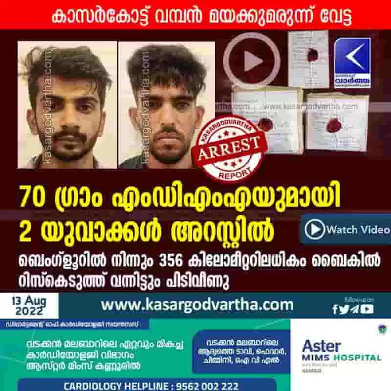 Youths arrested | കാസർകോട്ട് വമ്പൻ മയക്കുമരുന്ന് വേട്ട; 70 ഗ്രാം എംഡിഎംഎയുമായി 2 യുവാക്കൾ അറസ്റ്റിൽ; ബെംഗ്ളൂറിൽ നിന്നും 356 കിലോമീറ്ററിലധികം ബൈകിൽ റിസ്കെടുത്ത് വന്നിട്ടും പിടിവീണു