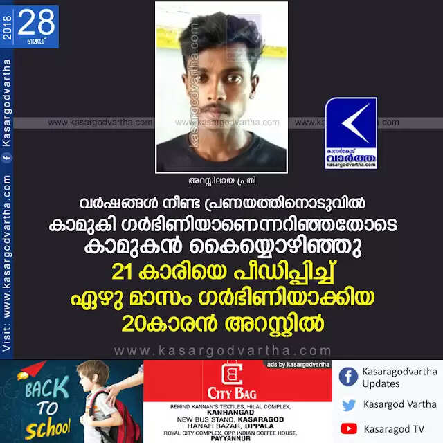 വര്ഷങ്ങള് നീണ്ട പ്രണയത്തിനൊടുവില് കാമുകി ഗര്ഭിണിയാണെന്നറിഞ്ഞതോടെ കാമുകന് കൈയ്യൊഴിഞ്ഞു; 21 കാരിയെ പീഡിപ്പിച്ച് ഏഴു മാസം ഗര്ഭിണിയാക്കിയ 20കാരന് അറസ്റ്റില്