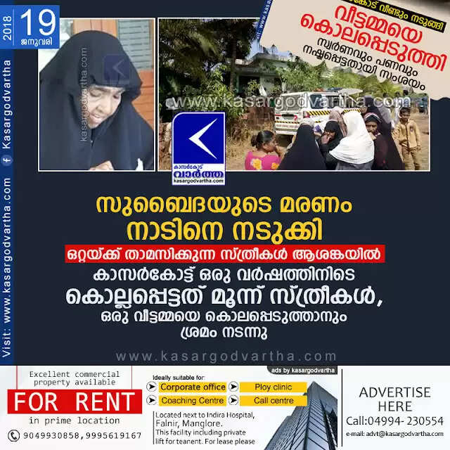 സുബൈദയുടെ മരണം നാടിനെ നടുക്കി; ഒറ്റയ്ക്ക് താമസിക്കുന്ന സ്ത്രീകള് ആശങ്കയില്; കാസര്കോട്ട് ഒരു വര്ഷത്തിനിടെ കൊല്ലപ്പെട്ടത് മൂന്ന് സ്ത്രീകള്, ഒരു വീട്ടമ്മയെ കൊലപ്പെടുത്താനും ശ്രമം നടന്നു