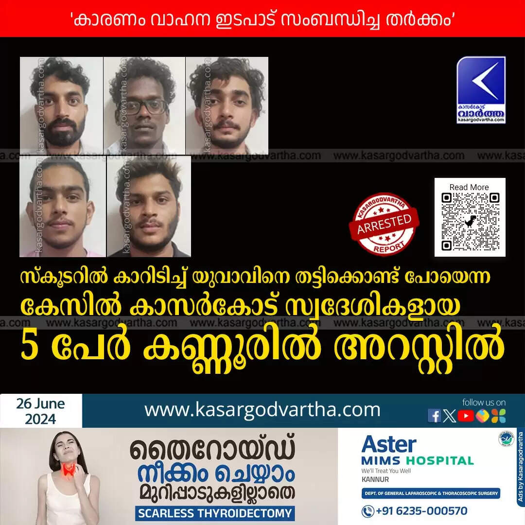 Arrested | സ്കൂടറിൽ കാറിടിച്ച് യുവാവിനെ തട്ടിക്കൊണ്ട് പോയെന്ന കേസിൽ കാസർകോട് സ്വദേശികളായ 5 പേർ കണ്ണൂരിൽ അറസ്റ്റിൽ