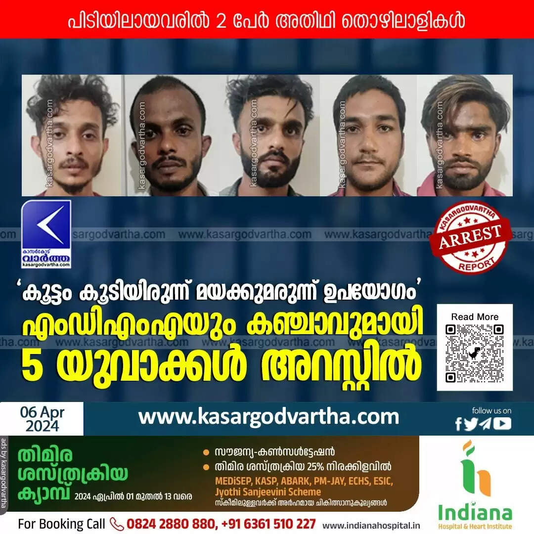 Arrested | 'കൂട്ടം കൂടിയിരുന്ന് മയക്കുമരുന്ന് ഉപയോഗം'; എം ഡി എം എയും കഞ്ചാവുമായി 5 യുവാക്കൾ അറസ്റ്റിൽ