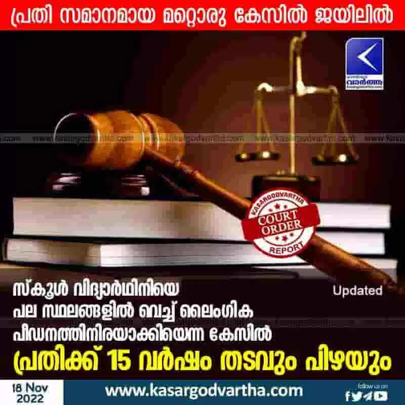 Court Verdict | സ്കൂള് വിദ്യാര്ഥിനിയെ പല സ്ഥലങ്ങളില് വെച്ച് ലൈംഗിക പീഡനത്തിനിരയാക്കിയെന്ന കേസില് പ്രതിക്ക് 15 വര്ഷം തടവും പിഴയും