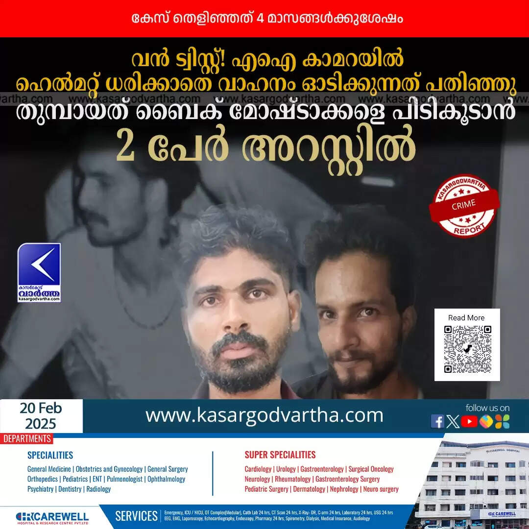 Crime | വൻ ട്വിസ്റ്റ്! എഐ കാമറയിൽ ഹെൽമറ്റ് ധരിക്കാതെ വാഹനം ഓടിക്കുന്നത് പതിഞ്ഞു; തുമ്പായത് ബൈക് മോഷ്ടാക്കളെ പിടികൂടാൻ; 2 പേർ അറസ്റ്റിൽ