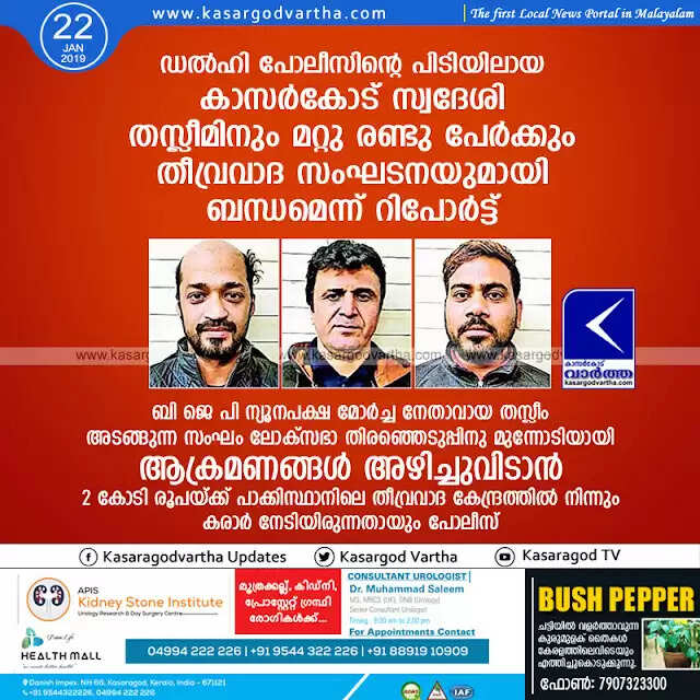 ഡല്ഹി പോലീസിന്റെ പിടിയിലായ കാസര്കോട് സ്വദേശി തസ്ലീമിനും മറ്റു രണ്ടു പേര്ക്കും തീവ്രവാദ സംഘടനയുമായി ബന്ധമെന്ന് റിപോര്ട്ട്; ബി ജെ പി ന്യൂനപക്ഷ മോര്ച്ച നേതാവായ തസ്ലീം അടങ്ങുന്ന സംഘം ലോക്സഭാ തിരഞ്ഞെടുപ്പിനു മുന്നോടിയായി ആക്രമണങ്ങള് അഴിച്ചുവിടാന് 2 കോടി രൂപയ്ക്ക് പാക്കിസ്ഥാനിലെ തീവ്രവാദ കേന്ദ്രത്തില് നിന്നും കരാര് നേടിയിരുന്നതായും പോലീസ്