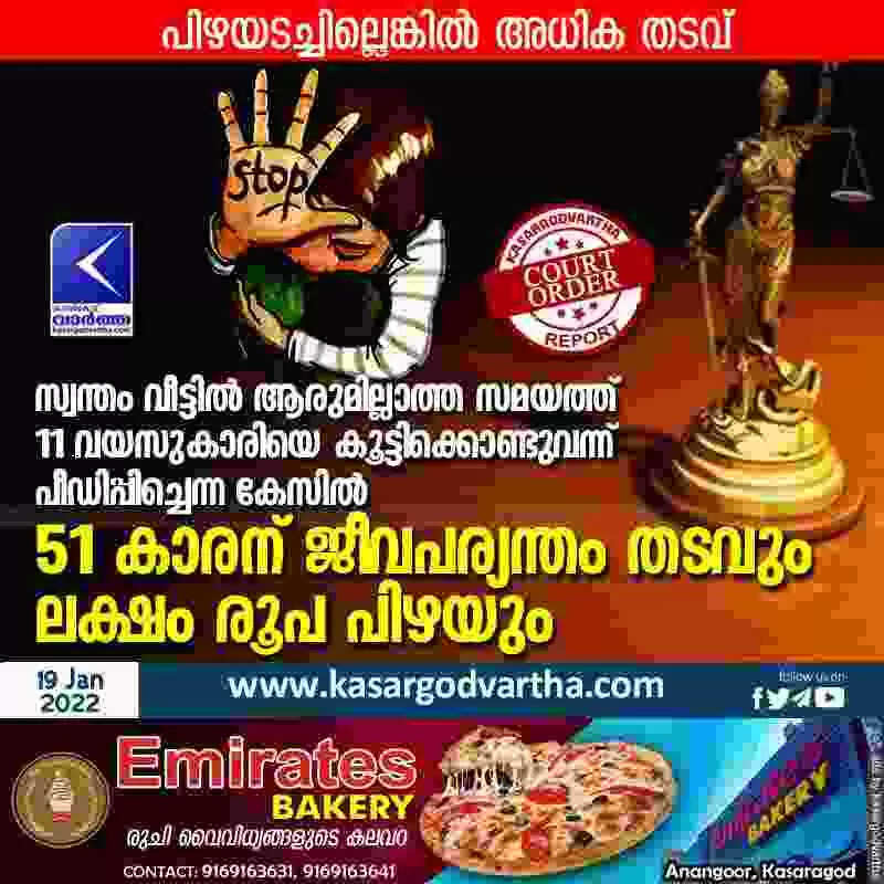Keywords: Kasaragod, Kerala, News, Top-Headlines, Molestation, Case, Complaint, Arrest, Police, Court, Court Order, Fine, Crime, Assault case; 51-year-old sentenced to life imprisonment and fine.