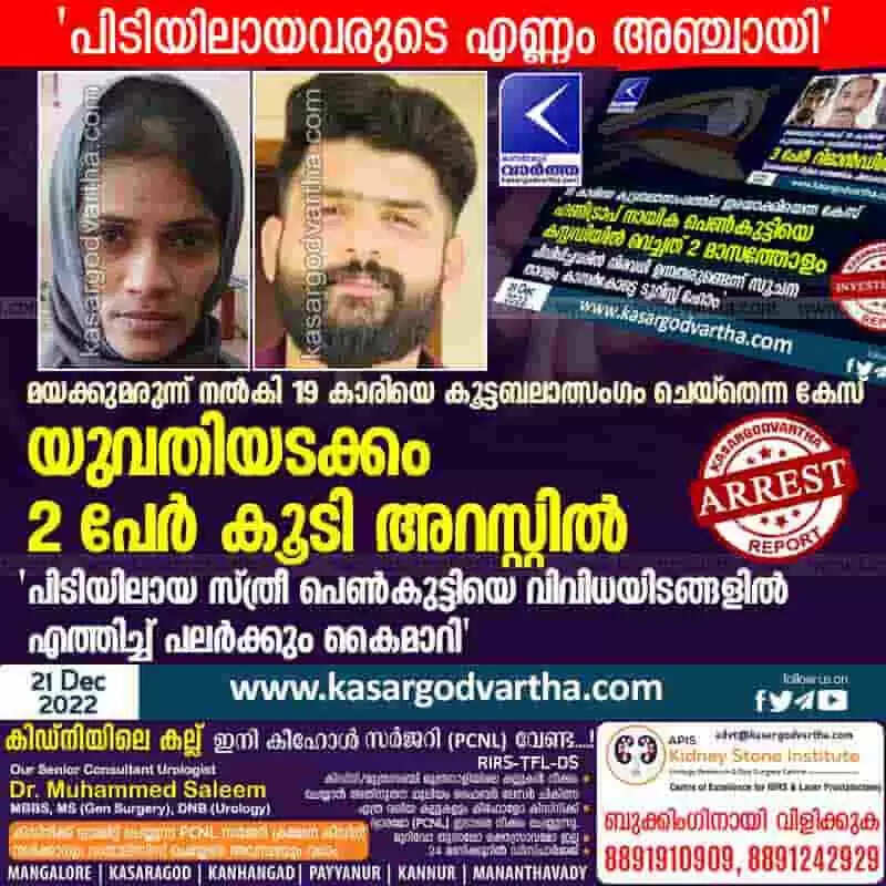 Arrested | മയക്കുമരുന്ന് നല്കി 19 കാരിയെ കൂട്ടബലാത്സംഗം ചെയ്തെന്ന കേസ്: യുവതിയടക്കം 2 പേര് കൂടി അറസ്റ്റില്; 'പിടിയിലായ സ്ത്രീ പെണ്കുട്ടിയെ വിവിധയിടങ്ങളില് എത്തിച്ച് പലര്ക്കും കൈമാറി'