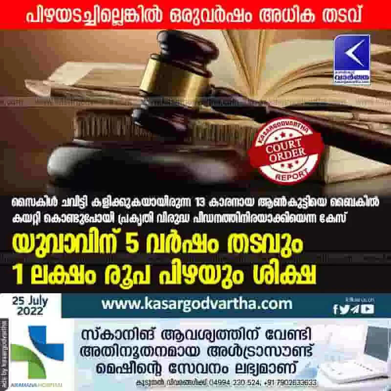 Court verdict | സൈകിള് ചവിട്ടി കളിക്കുകയായിരുന്ന 13 കാരനായ ആണ്കുട്ടിയെ ബൈകില് കയറ്റി കൊണ്ടുപോയി പ്രകൃതി വിരുദ്ധ പീഡനത്തിനിരയാക്കിയെന്ന കേസ്: യുവാവിന് 5 വര്ഷം തടവും 1 ലക്ഷം രൂപ പിഴയും ശിക്ഷ