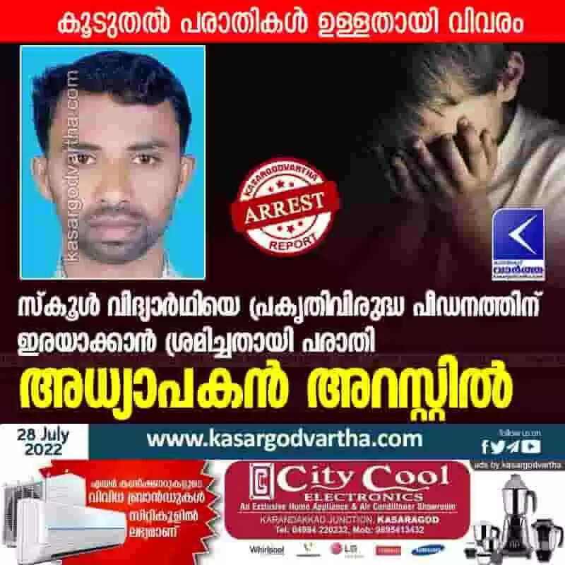 Keywords: News, Kerala, Kasaragod, Top-Headlines, Crime, Molestation-attempt, Assault, Complaint, Arrested, Teacher, Student, Pocso, Assault compalint; teacher arrested.