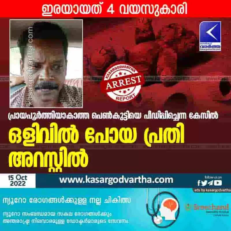 ദിവസങ്ങള്ക്ക് മുമ്പ് ബദിയടുക്ക സ്റ്റേഷന് പരിധിയിലെ വാടക ക്വാര്ടേര്സില് വെച്ച് നാല് വയസുകാരിയെ ഇയാള് പീഡനത്തിനിരയാക്കിയെന്നാണ് കേസ്. കുട്ടി വീട്ടുകാരോട് വിവരം പറഞ്ഞതോടെ പൊലീസില് പരാതി നല്കുകയായിരുന്നു.