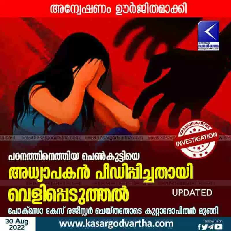 പെണ്കുട്ടിയുടെ പരാതിയില് അധ്യാപകനായ വയനാട് സ്വദേശിയും വെള്ളരിക്കുണ്ട് പൊലീസ് സ്റ്റേഷന് പരിധിയില് താമസക്കാരനുമായ മുഹമ്മദ് ഹാരിസി (43) നെതിരെ വെള്ളരിക്കുണ്ട് പൊലീസ് പോക്സ പ്രകാരം കേസെടുത്തു. ഇതോടെ അധ്യാപകന് ഒളിവില് പോയിരിക്കുകയാണ്. ഇയാളെ കണ്ടെത്താനായി അന്വേഷണം ഊര്ജിതമാക്കി.