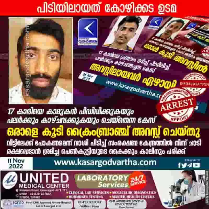 Arrested | 17 കാരിയെ കാമുകന് പീഡിപ്പിക്കുകയും പലര്ക്കും കാഴ്ചവക്കുകയും ചെയ്തെന്ന കേസ്: ഒരാളെ കൂടി ക്രൈംബ്രാഞ്ച് അറസ്റ്റ് ചെയ്തു; പിടിയിലായത് കോഴിക്കട ഉടമ; വീട്ടിലേക്ക് പോകണമെന്ന് വാശി പിടിച്ച് സംരക്ഷണ കേന്ദ്രത്തില് നിന്ന് ചാടി രക്ഷപ്പെടാന് ശ്രമിച്ച പെണ്കുട്ടിയുടെ കൈക്കും കാലിനും പരിക്ക്