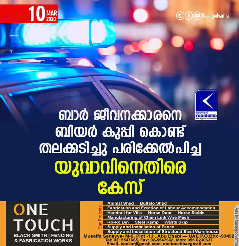ബാര് ജീവനക്കാരനെ ബിയര് കുപ്പി കൊണ്ട് തലക്കടിച്ചു പരിക്കേല്പിച്ച യുവാവിനെതിരെ കേസ്