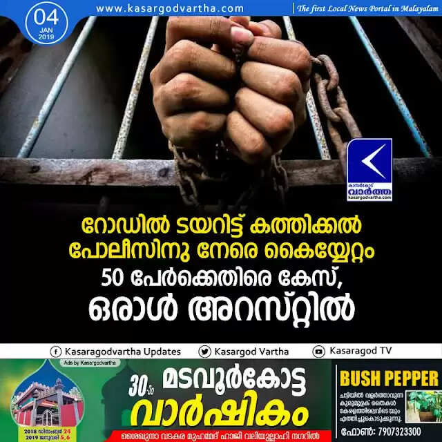 റോഡില് ടയറിട്ട് കത്തിക്കല്, പോലീസിനു നേരെ കൈയ്യേറ്റം; 50 പേര്ക്കെതിരെ കേസ്, ഒരാള് അറസ്റ്റില്