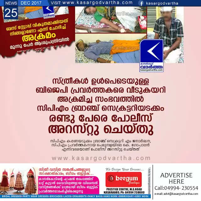 സ്ത്രീകള് ഉള്പെടെയുള്ള ബിജെപി പ്രവര്ത്തകരെ വീടുകയറി അക്രമിച്ച സംഭവത്തില് സിപിഎം ബ്രാഞ്ച് സെക്രട്ടറിയടക്കം രണ്ടു പേരെ പോലീസ് അറസ്റ്റു ചെയ്തു