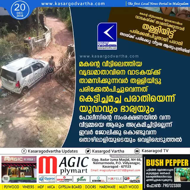 കാസര്കോട്: (www.kasargodvartha.com 20.12.2018) മകന്റെ വീട്ടിലെത്തിയ വൃദ്ധമാതാവിനെ വാടകയ്ക്ക് താമസിക്കുന്നവര് തള്ളിയിട്ടു പരിക്കേല്പിച്ചുവെന്നത് കെട്ടിച്ചമച്ച പരാതിയെന്ന് യുവാവും ഭാര്യയും. പോലീസിന്റെ സംരക്ഷണയില് വന്ന വീട്ടമ്മയെ ആരും അക്രമിച്ചിട്ടില്ലെന്ന് ഇവര് ജോലിക്കു കൊണ്ടുവന്ന തൊഴിലാളിയും വെളിപ്പെടുത്തി. ബുധനാഴ്ച രാവിലെയാണ് കൊല്ലം ചവറ സ്വദേശിനിയായ വാസുദേവന് പിള്ളയുടെ ഭാര്യ രാധാമണിയമ്മ (69) തന്നെ മകന്റെ വീടിന്റെ മുകള് നിലയില് വാടകയ്ക്ക് താമസിച്ചുവരുന്ന യുവാവ് തള്ളിയിട്ട് പരിക്കേല്പിച്ചതായി ആരോപിച്ച് കാസര്കോട് ജനറല് ആശുപത്രിയില് ചികിത്സ തേടിയത്.
