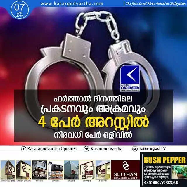 ഹര്ത്താല് ദിനത്തിലെ പ്രകടനവും അക്രമവും; 4 പേര് അറസ്റ്റില്, നിരവധി പേര് ഒളിവില്