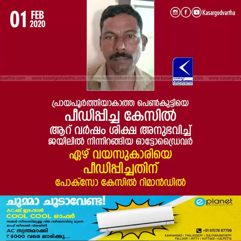 പ്രായപൂര്ത്തിയാകാത്ത പെണ്കുട്ടിയെ പീഡിപ്പിച്ച കേസില് ആറ് വര്ഷം ശിക്ഷ അനുഭവിച്ച് ജയിലില് നിന്നിറങ്ങിയ ഓട്ടോഡ്രൈവര് ഏഴ് വയസുകാരിയെ പീഡിപ്പിച്ചതിന് പോക്സോ കേസില് റിമാന്ഡില്