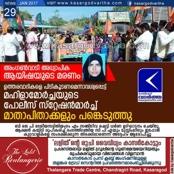 അംഗണ്വാടി അധ്യാപിക ആയിഷയുടെ മരണം; ഉത്തരവാദികളെ പിടികൂടണമെന്നാവശ്യപ്പെട്ട് മഹിളാമോര്ച്ചയുടെ പോലീസ് സ്റ്റേഷന്മാര്ച്ച്; മാതാപിതാക്കളും പങ്കെടുത്തു