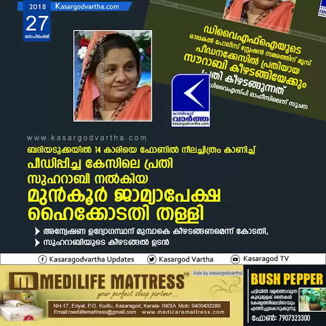 ബദിയടുക്കയില് 14 കാരിയെ ഫോണില് നീലച്ചിത്രം കാണിച്ച് പീഡിപ്പിച്ച കേസിലെ പ്രതി സുഹറാബി നല്കിയ മുന്കൂര് ജാമ്യാപേക്ഷ ഹൈക്കോടതി തള്ളി; അന്വേഷണ ഉദ്യോഗസ്ഥന് മുമ്പാകെ കീഴടങ്ങണമെന്ന് കോടതി, സുഹറാബിയുടെ കീഴടങ്ങല് ഉടന്