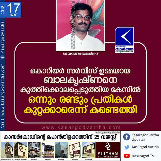 കൊറിയര്‍ സര്‍വീസ് ഉടമയായ ബാലകൃഷ്ണനെ കുത്തിക്കൊലപ്പെടുത്തിയ കേസില്‍ ഒന്നും രണ്ടും പ്രതികള്‍ കുറ്റക്കാരെന്ന് കണ്ടെത്തി