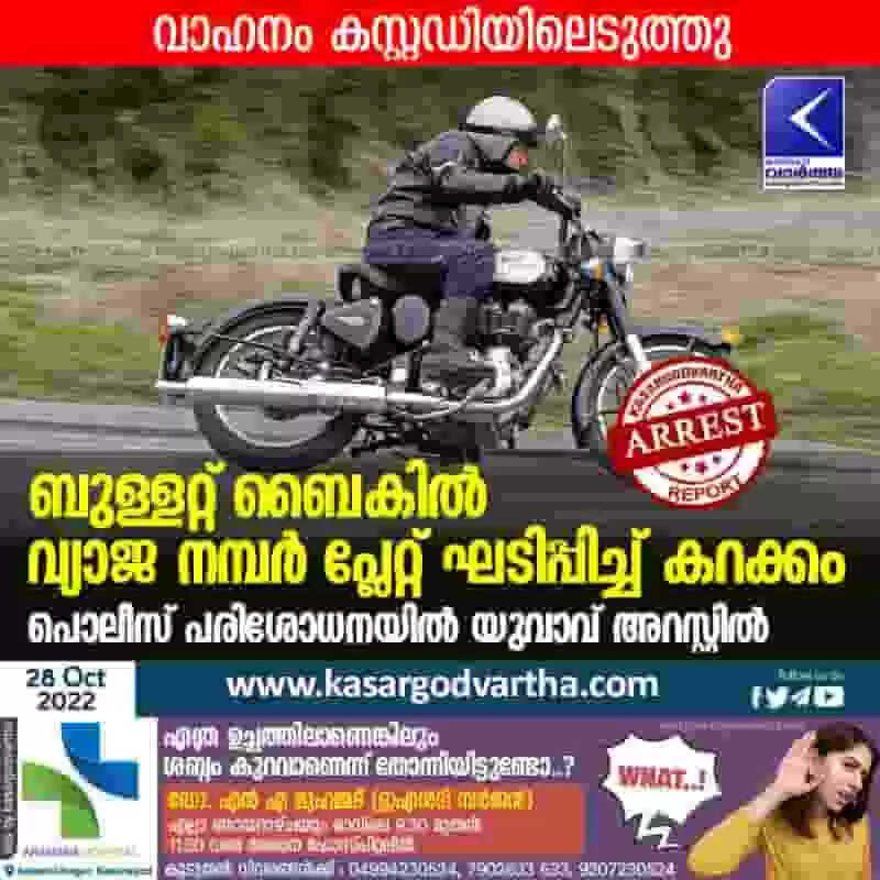 Arrested | ബുള്ളറ്റ് ബൈകില് വ്യാജ നമ്പര് പ്ലേറ്റ് ഘടിപ്പിച്ച് കറക്കം; പൊലീസ് പരിശോധനയില് യുവാവ് അറസ്റ്റില്