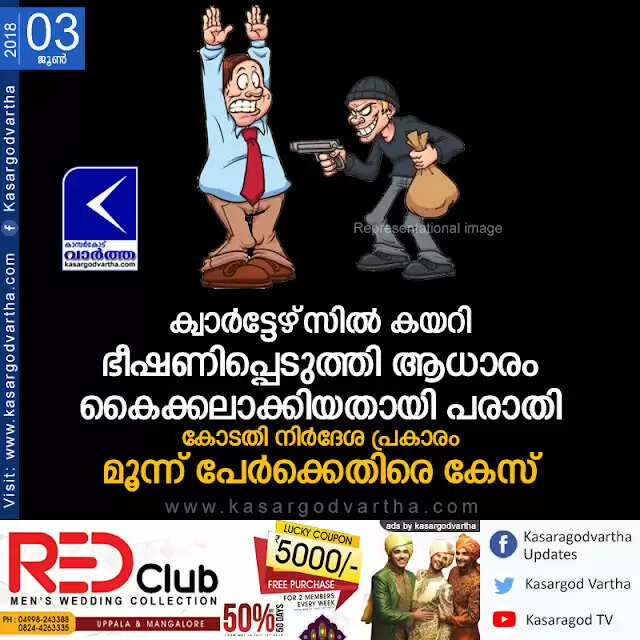 ക്വാര്ട്ടേഴ്സില് കയറി ഭീഷണിപ്പെടുത്തി ആധാരം കൈക്കലാക്കിയതായി പരാതി; കോടതി നിര്ദേശ പ്രകാരം മൂന്ന് പേര്ക്കെതിരെ കേസ്