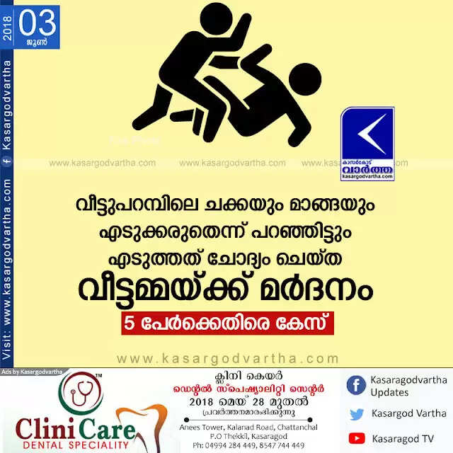 വീട്ടുപറമ്പിലെ ചക്കയും മാങ്ങയും എടുക്കരുതെന്ന് പറഞ്ഞിട്ടും എടുത്തത് ചോദ്യം ചെയ്ത വീട്ടമ്മയ്ക്ക് മര്ദനം; 5 പേര്ക്കെതിരെ കേസ്