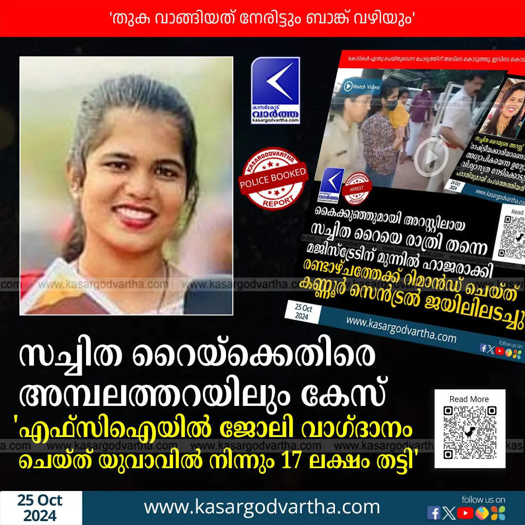 Fraud | സച്ചിത റൈയ്ക്കെതിരെ അമ്പലത്തറയിലും കേസ്; 'എഫ്സിഐയിൽ ജോലി വാഗ്ദാനം ചെയ്ത് യുവാവിൽ നിന്നും 17 ലക്ഷം തട്ടി'
