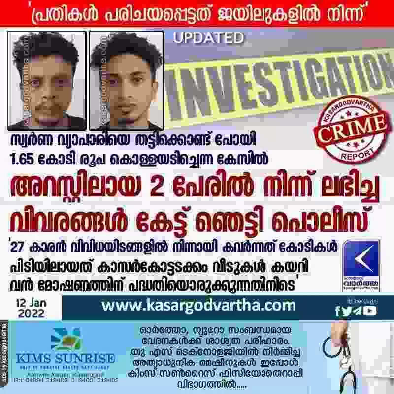 സ്വര്‍ണ വ്യാപാരിയെ തട്ടിക്കൊണ്ട് പോയി 1.65 കോടി രൂപ കൊള്ളയടിച്ചെന്ന കേസിൽ അറസ്റ്റിലായ 2 പേരിൽ നിന്ന് ലഭിച്ച വിവരങ്ങൾ കേട്ട് ഞെട്ടി പൊലീസ്; '27 കാരൻ വിവിധയിടങ്ങളിൽ നിന്നായി കവർന്നത് കോടികൾ; പിടിയിലായത് കാസർകോട്ടടക്കം വീടുകൾ കയറി വൻ മോഷണത്തിന് പദ്ധതിയൊരുക്കുന്നതിനിടെ'
