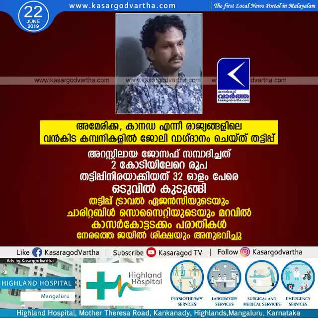 അമേരിക്ക, കാനഡ എന്നീ രാജ്യങ്ങളിലെ വന്കിട കമ്പനികളില് ജോലി വാഗ്ദാനം ചെയ്ത് തട്ടിപ്പ്; അറസ്റ്റിലായ ജോസഫ് സമ്പാദിച്ചത് 2 കോടിയിലേറെ രൂപ, തട്ടിപ്പിനിരയാക്കിയത് 32 ഓളം പേരെ, ഒടുവില് കുടുങ്ങി, തട്ടിപ്പ് ട്രാവല് ഏജന്സിയുടെയും ചാരിറ്റബിള് സൊസൈറ്റിയുടെയും മറവില്, കാസര്കോട്ടടക്കം പരാതികള്, നേരത്തെ ജയില് ശിക്ഷയും അനുഭവിച്ചു