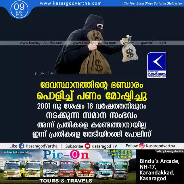 ദേവസ്ഥാനത്തിന്റെ ഭണ്ഡാരം പൊളിച്ച് പണം മോഷ്ടിച്ചു; 2001 നു ശേഷം 18 വര്ഷത്തനിപ്പുറം നടക്കുന്ന സമാന സംഭവം, അന്ന് പ്രതികളെ കണ്ടെത്താനായില്ല, ഇന്ന് പ്രതികളെ തേടിയിറങ്ങി പോലീസ്