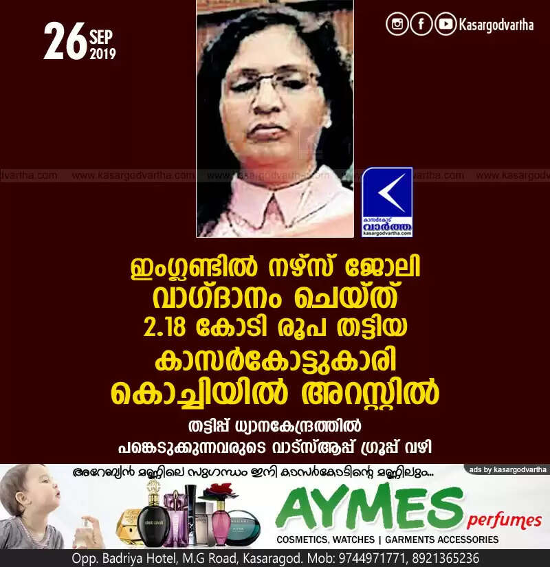 ഇംഗ്ലണ്ടില് നഴ്സ് ജോലി വാഗ്ദാനം ചെയ്ത് 2.18 കോടി രൂപ തട്ടിയ കാസര്കോട്ടുകാരി കൊച്ചിയില് അറസ്റ്റില്; തട്ടിപ്പ് ധ്യാനകേന്ദ്രത്തില് പങ്കെടുക്കുന്നവരുടെ വാട്സ്ആപ്പ് ഗ്രൂപ്പ് വഴി