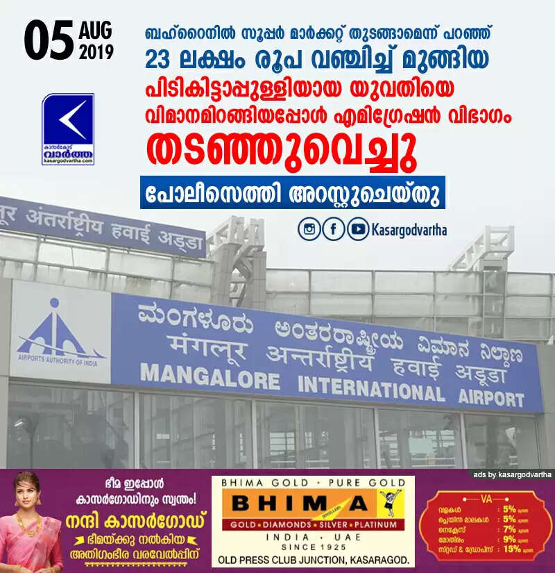 ബഹ്‌റൈനില്‍ സൂപ്പര്‍ മാര്‍ക്കറ്റ് തുടങ്ങാമെന്ന് പറഞ്ഞ് 23 ലക്ഷം രൂപ വഞ്ചിച്ച് മുങ്ങിയ പിടികിട്ടാപ്പുള്ളിയായ യുവതിയെ വിമാനമിറങ്ങിയപ്പോള്‍ എമിഗ്രേഷന്‍ വിഭാഗം തടഞ്ഞുവെച്ചു; പോലീസെത്തി അറസ്റ്റു ചെയ്തു