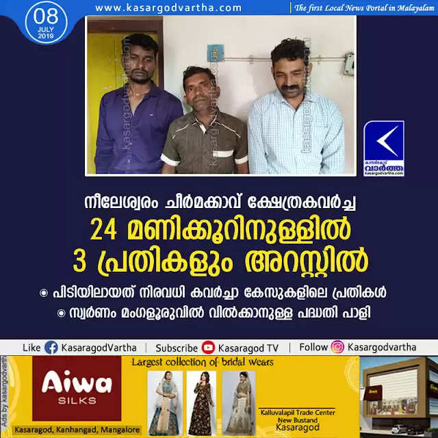Keywords: Kasaragod, Kerala, news, Top-Headlines, Robbery, case, Crime, arrest, accused, Neeleswaram, Cheermakkavu temple robbery; 3 arrested