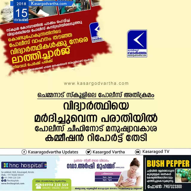 ചെമ്മനാട് സ്കൂളിലെ പോലീസ് അതിക്രമം; വിദ്യാര്ത്ഥിയെ മര്ദിച്ചുവെന്ന പരാതിയില് പോലീസ് ചീഫിനോട് മനുഷ്യാവകാശ കമ്മീഷന് റിപോര്ട്ട് തേടി