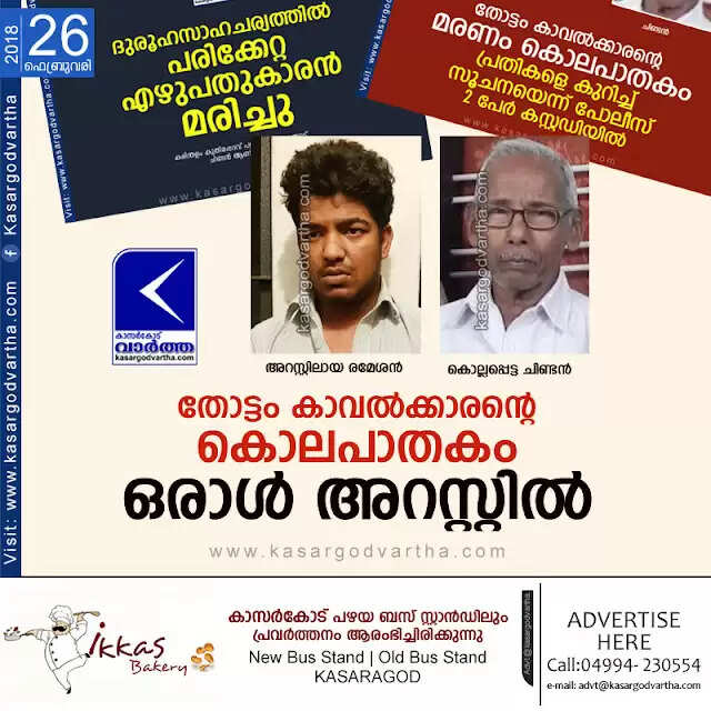 കാഞ്ഞങ്ങാട്: (www.kasargodvartha.com 26.02.2018) കിനാനൂര് കരിന്തളം പഞ്ചായത്തില് കുമ്പളപ്പള്ളിയിലെ കരിമ്പില് പ്ലാന്റേഷന് തോട്ടത്തിലെ കാവല്ക്കാരന് കാലിച്ചാമരം പള്ളിപ്പാറയിലെ പയങ്ങപ്പാടന് ചിണ്ടന്റെ (75) കൊലപാതകവുമായി ബന്ധപ്പെട്ട് ഒരാളെ പോലീസ് അറസ്റ്റു ചെയ്തു. തമിഴ്നാട് ഗൂഡല്ലൂരിലെ രമേശന് എന്ന പാര്ത്ഥിപനെ (19)യാണ് നീലേശ്വരം പോലീസ് അറസ്റ്റു ചെയ്തത്.